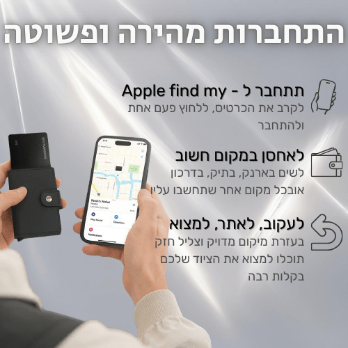 הכרטיס נוצר ככה שהשימוש בו יהיה מאוד פשוט ומהיר, במיוחד בשביל שתוכל לשמור על הציוד שלך, דבר ראשון מתחברים ל Apple find my , הוספת פריט, לחיצה אחת על הכפתור בכרטיס והתחברתם! מה שנשאר זה לאחסן במקום חשוב ולהתחיל לעקוב